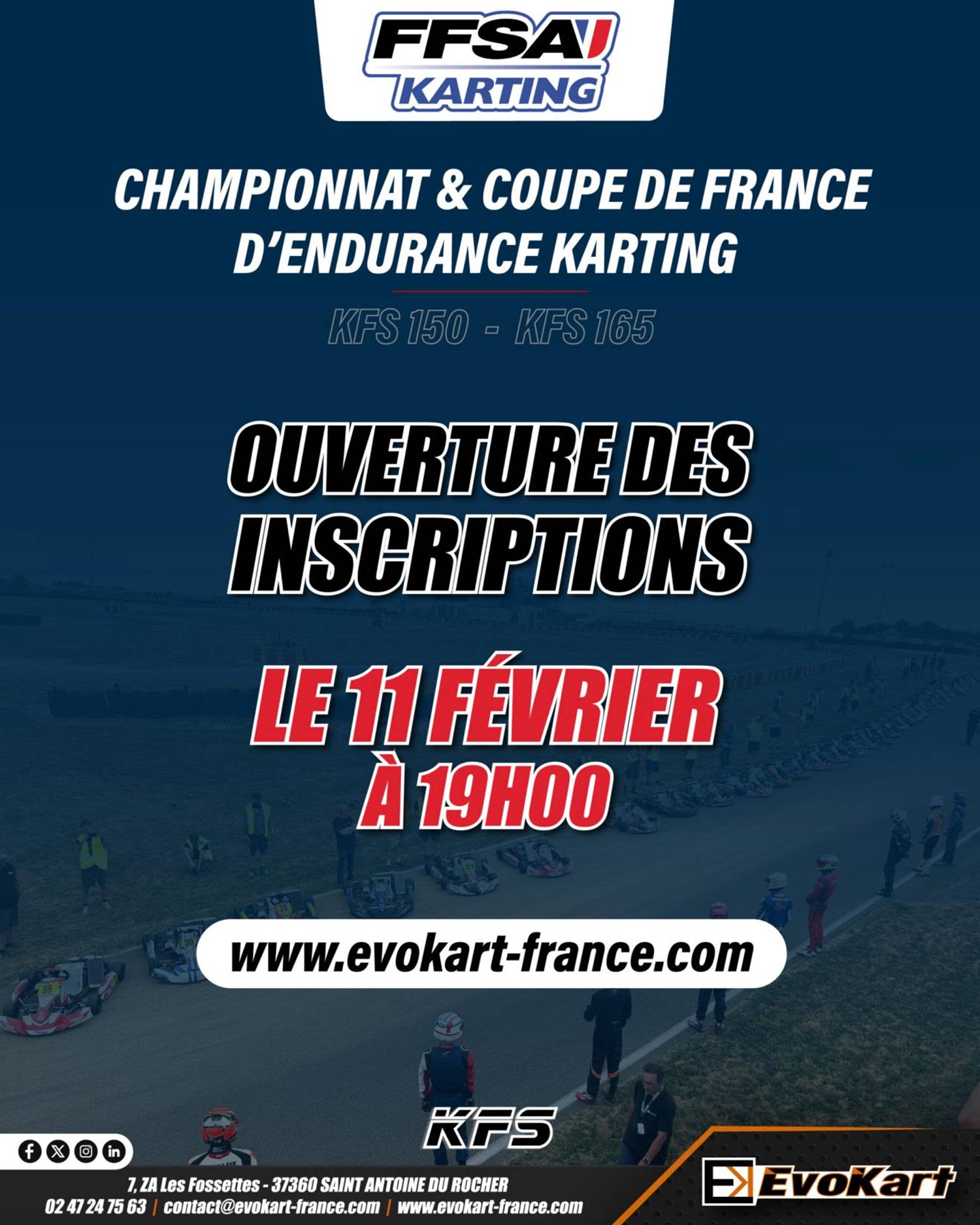 Que vous souhaitiez participer à une course, deux courses, trois courses ou au championnat complet, nous vous invitons à nous retourner votre bulletin le plus rapidement possible par e-mail, quel que soit votre moyen de paiement, à l’adresse suivante : organisation@evokart-france.com